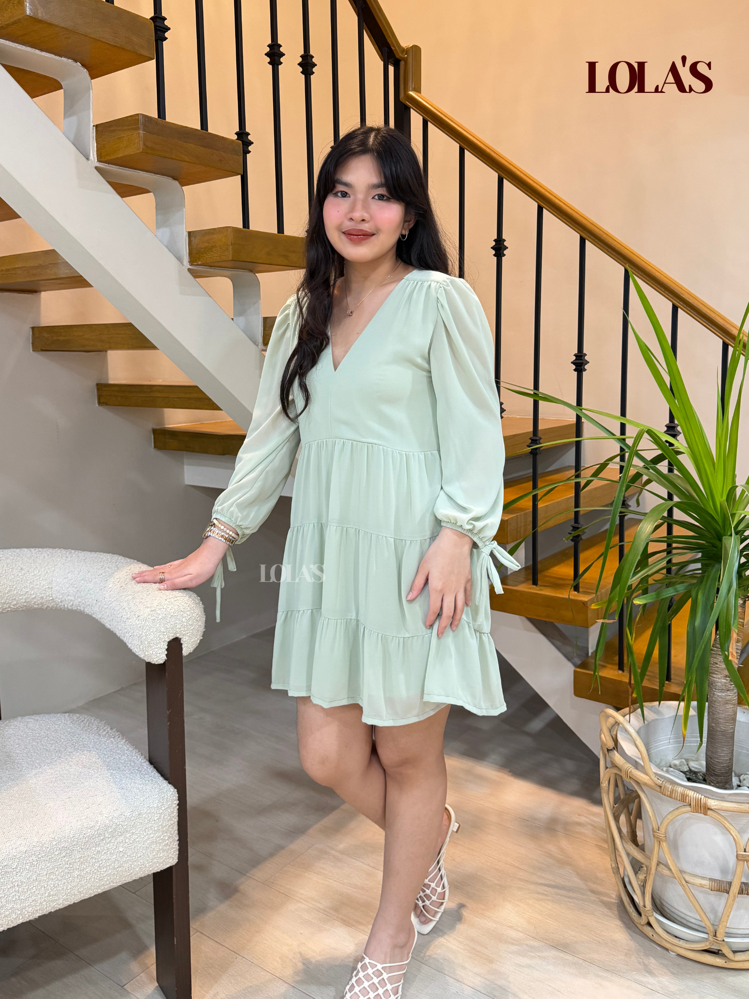 A flattering tiered mini dress with a V-neckline, long sleeves, and a flowy silhouette. Made from light, chiffon fabric. Easy to style for casual days, brunch dates, or dressed-up occasions.